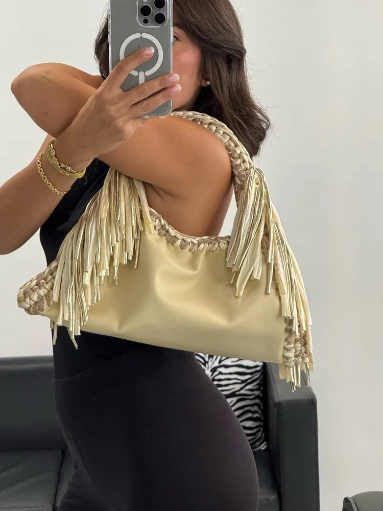 Il crochet che incornicia Claire non è solo decorativo: è parte integrante della sua architettura. Ogni filo è intrecciato per dare struttura, forma e ritmo. La borsa prende vita tra le mani, lentamente, come un gesto meditativo.
