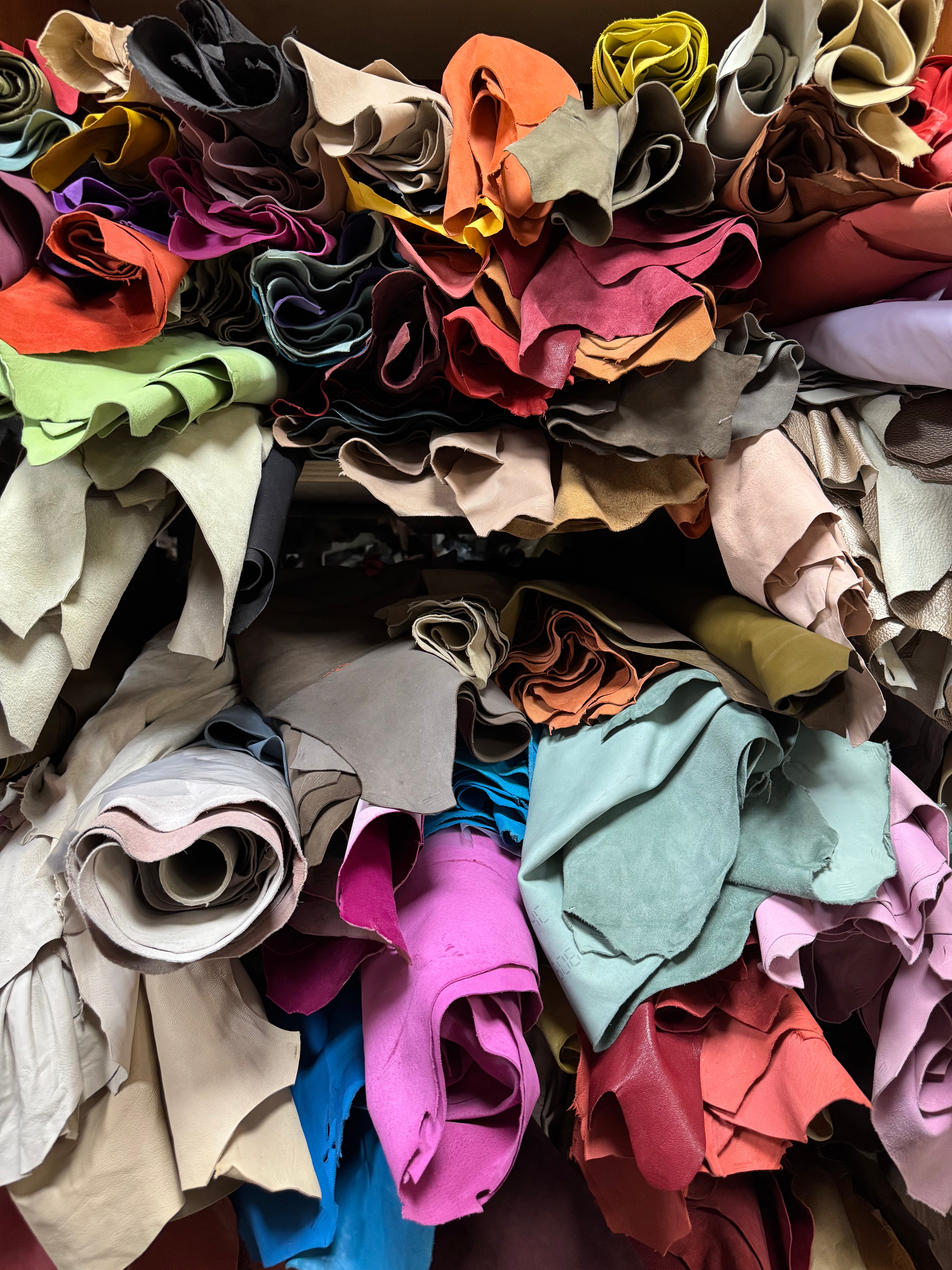 solo pelli di prima scelta, provenienti dalle case di moda più rinomate. Ogni pelle viene selezionata per la sua grana, elasticità e profondità di colore. Anche i filati che impiego per le rifiniture sono di altissima qualità italiana – dal velluto alla lycra, dal cotone fino alla lana – e cambiano a seconda dell’ispirazione e del carattere della borsa.
