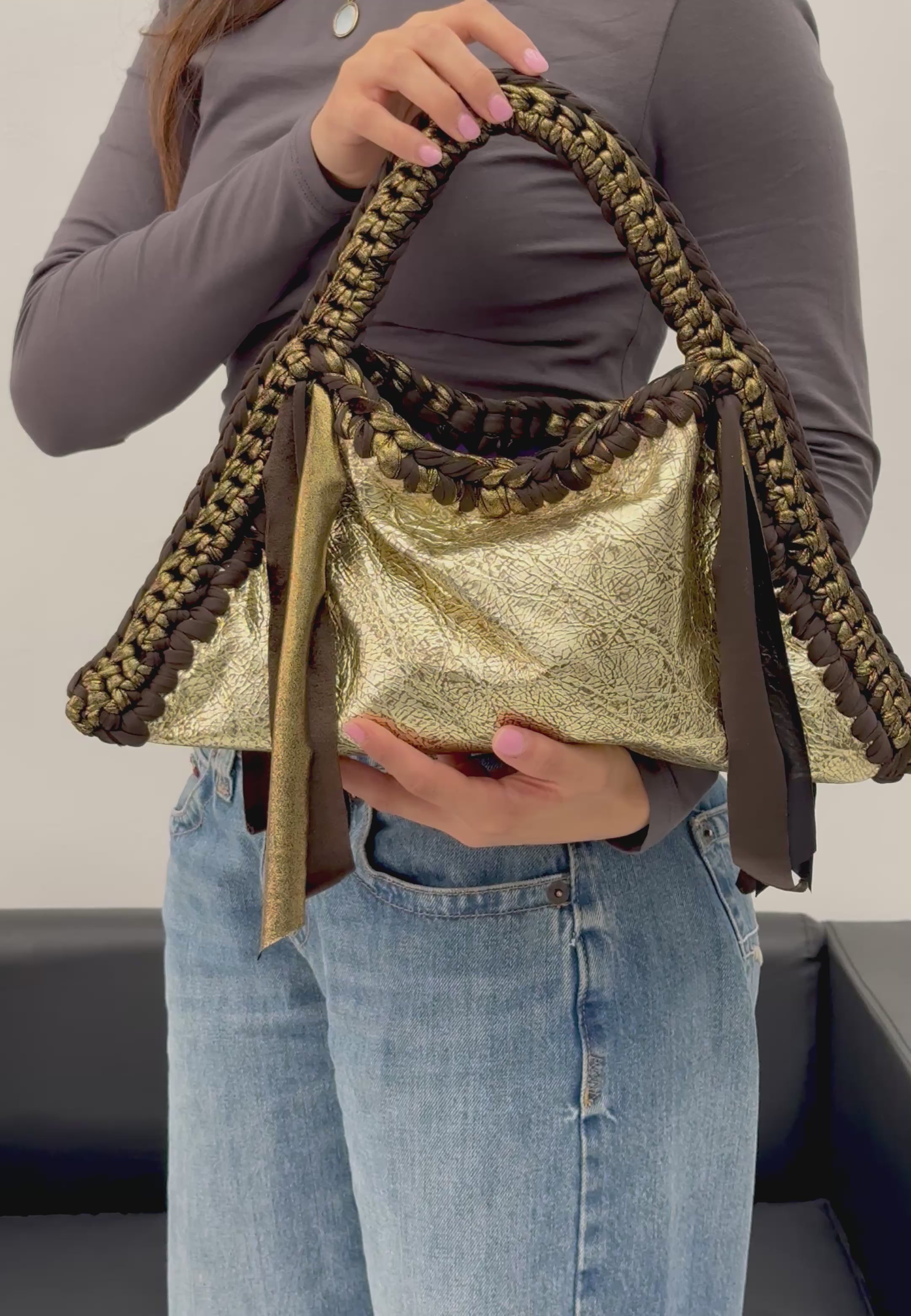 LA VERSIONE MEDIA DELLA MINI CLAIRE IN VERA PELLE, DECORATA E RIFINITA CON FETTUCCIA INTRECCIATA LAVORATA A MANO.